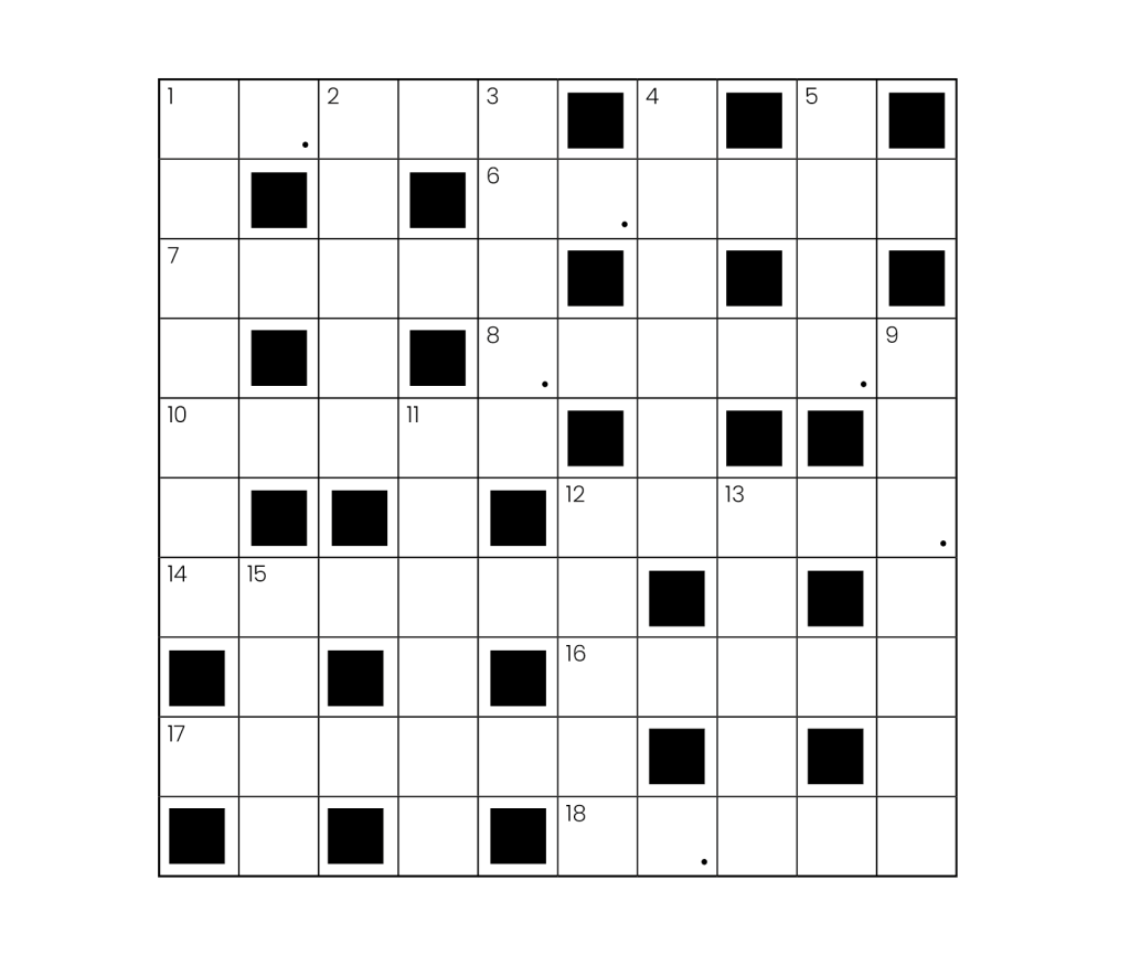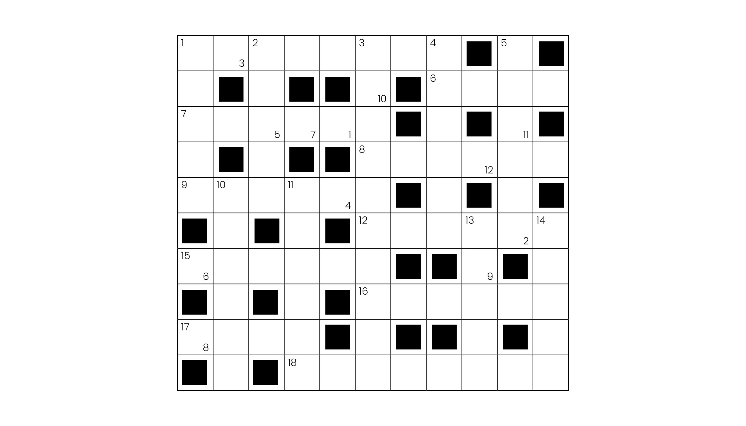 W krzyżówce jolce definicje odgadywanych haseł podaje się w przypadkowej kolejności. Do diagramu należy wpisać pary wyrazów różniących się ujawnionymi literami. Określono tylko jedno słowo z każdej pary. Litery z ponumerowanych od 1 do 11 kratek utworzą rozwiązanie: personalia postaci z utworu Edmunda Niziurskiego.