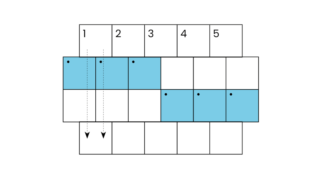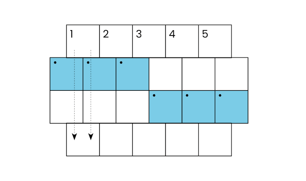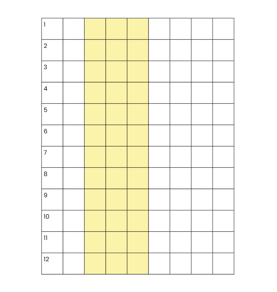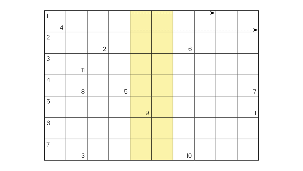 Sposób wpisywania wyrazów pokazano strzałkami w pierwszym rzędzie. Litery w kolorowych kratkach, czytane rzędami, oraz litery z ponumerowanych kratek od 1 do 11 utworzą rozwiązanie: tytuły utworów Edmunda Niziurskiego.