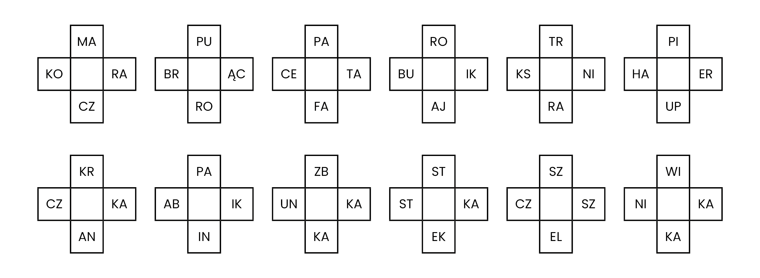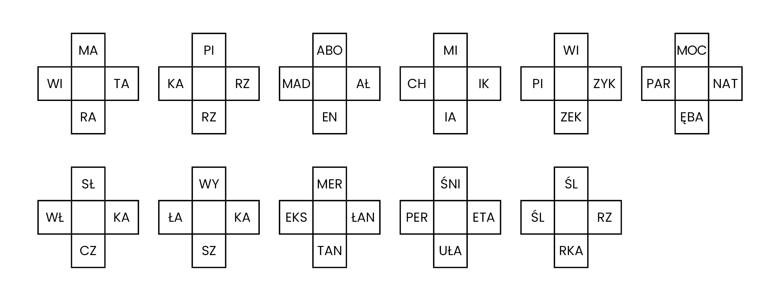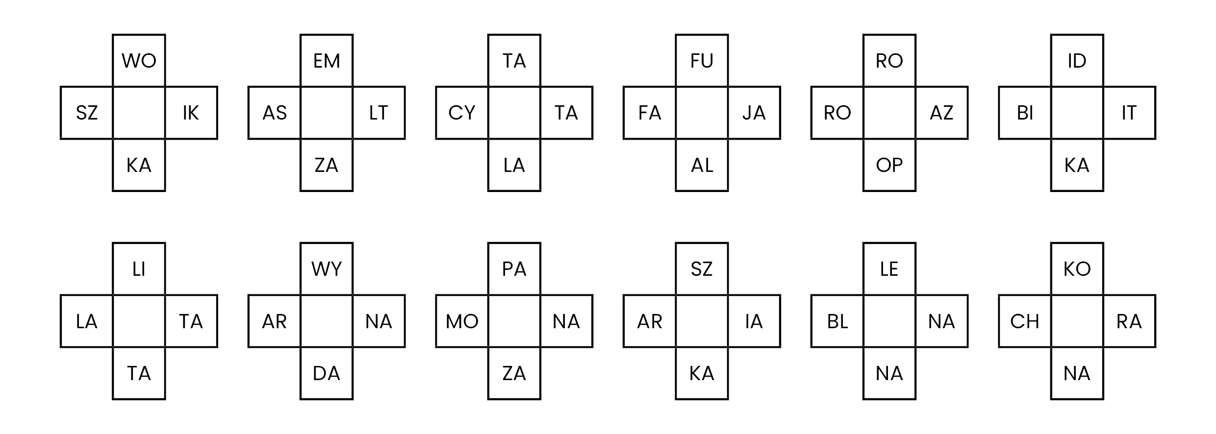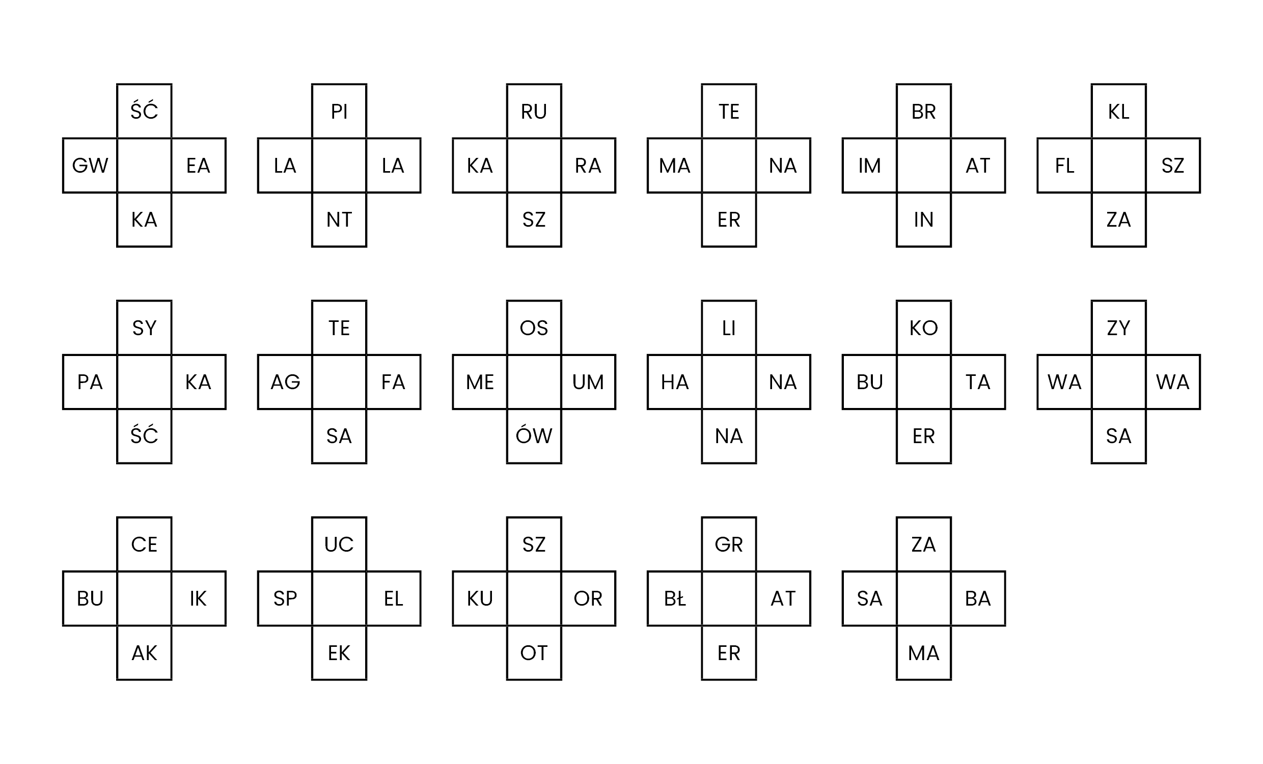 Po uzupełnieniu pustego pola parą liter powstaną dwa krzyżujące się rzeczowniki pisane małą literą, z jednym wyjątkiem (nazwisko głównego bohatera powieści Michała Choromańskiego Zazdrość i medycyna). Dopisane litery, czytane rzędami, utworzą okolicznościowe rozwiązanie.