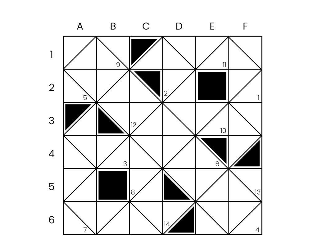 RozwiązanieNierucha. Rzędami: Kiwajłło (wspak), Julia, Michał (wspak), Miksa, Marek, Pelagia. Kolumnami: Tymoteusz, Ciamciara, Trepka (wspak), Warszawa (wspak), Babinicz (wspak), Juliusz (wspak).